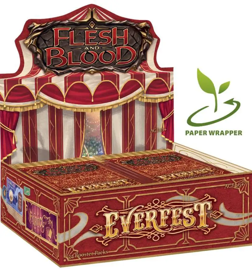 Step right up, step right up! The greatest show in Rathe is coming to a town near you! Everfest is a supplementary booster set, designed to expand constructed play with new cards for every hero in the game. Within the bustling grounds of the Everfest carnival, all fashion of performers, peddlers, and frolicking fun is to be found. Will you find fun, fame, or good fortune in the carnival slot of your Everfest booster pack, or perhaps take center stage and become the star of the show? ! A world first! Everfest is the world’s first full production TCG product featuring fully recyclable paper booster wrappers! Production scale paper flowwraps have been years in the making. In partnership with Cartamundi, we are proud to not only be the industry leader in material sustainability, but for setting a new standard in consumer product experience. Everfest boosters look and feel incredible! 198 card set (1 Fabled, 3 Legendary, 45 Majestic, 61 Rares, 88 Commons)