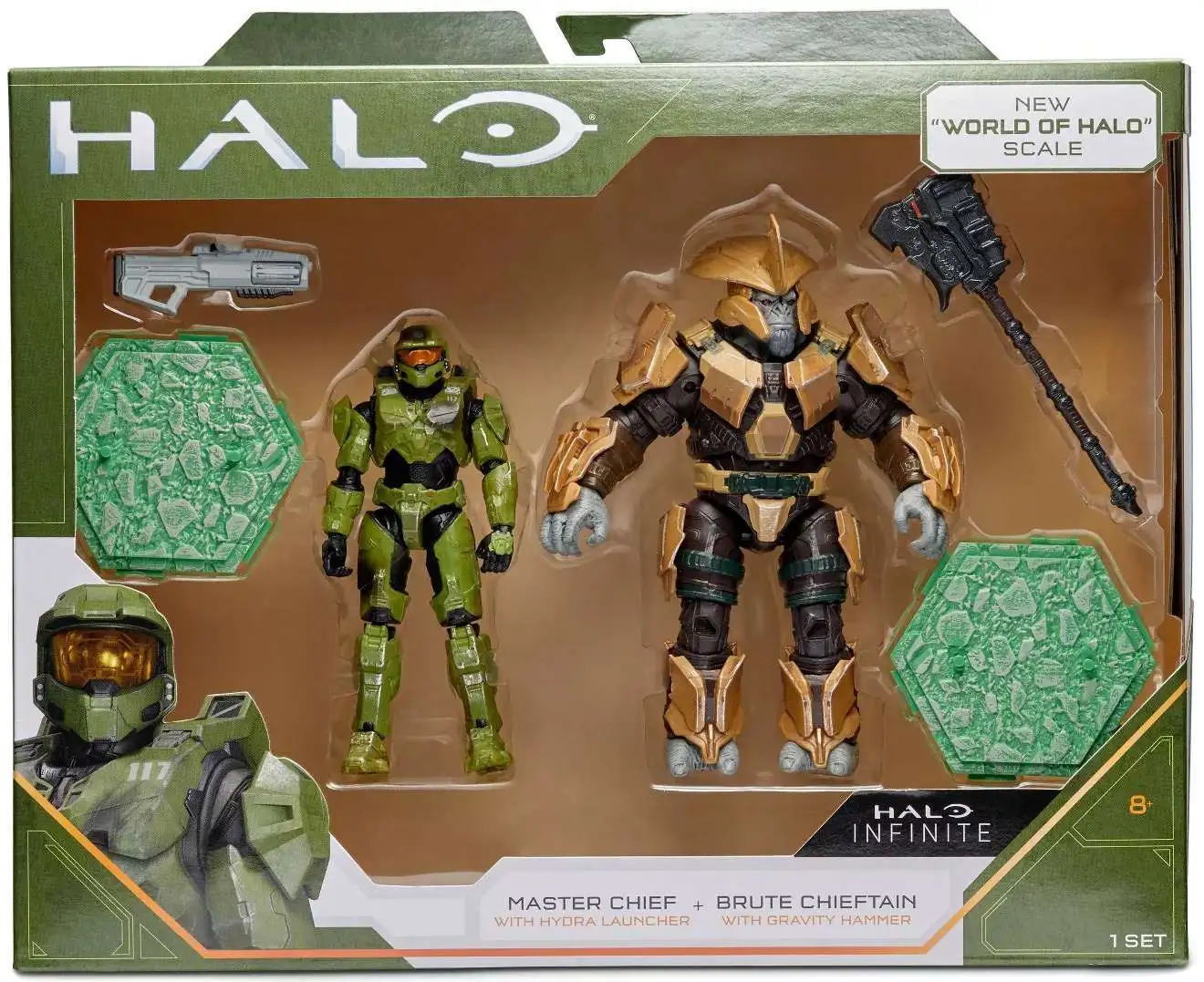 Enter the heat of battle with this 4 World of Halo Two Figure Pack! Reload the Hydra Launcher and equip the Master Chief as he faces off against the fearsome Brute Chieftain who wields a Gravity Hammer! Inside this Two Figure Pack youll find two fully articulated figures, each with a weapon accessory and terrain stand, that are authentically detailed and scaled to appear as they do in the Halo Infinite video game. An officially licensed Halo product from Wicked Cool Toys, a Jazwares Company!