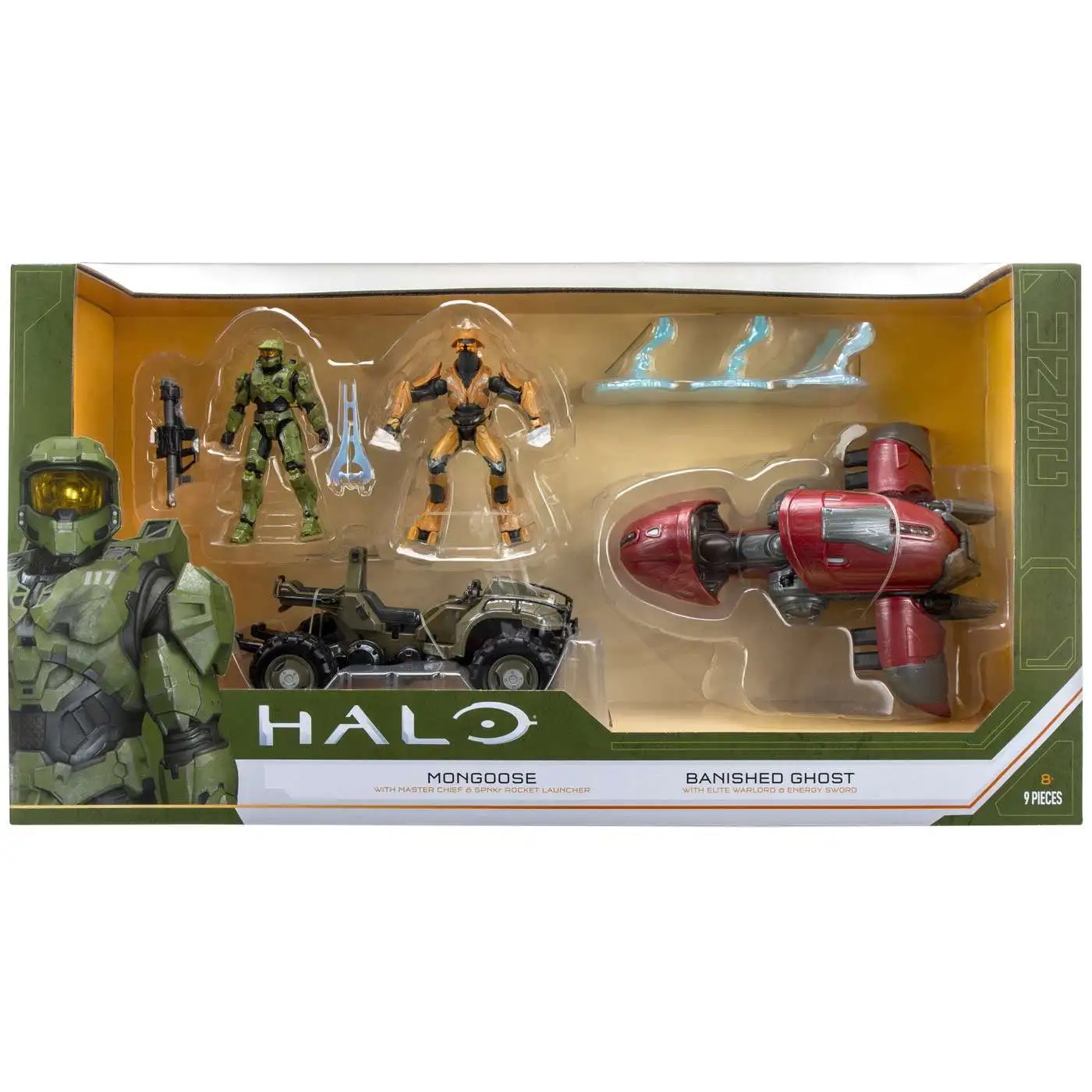 Features 1 Master Chief figure, 1 Mongoose Vehicle, 1 Elite Warlord figure, 1 Banished Ghost Vehicle & 2 Accessories