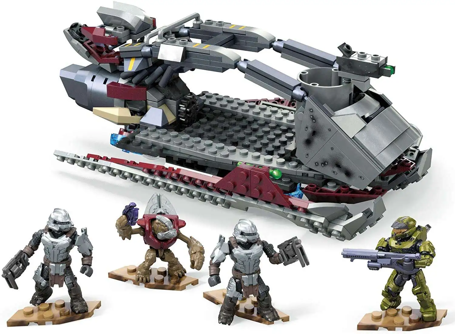 Take your troops where they’re needed with this Banished Skiff construction set. Inspired by a non-playable vehicle from Halo Infinite, this Skiff features a spinning turret that spins when you turn its exhaust pipe. Or choose to build a walker and fortified cover wall. This playset also includes 4 micro action figures that can be placed inside your vehicle of choice. Relocate to where you’re needed most. Ideal for Probuilders. This Halo Infinite inspired Banished Skiff vehicle building set includes 4 highly collectible micro action figures, Spartan MK VII, 2 Brute Warriors and a Grunt Conscript, with authentic detail, 12 points of articulation, display stands and interchangeable weapon accessories. This building set features 452 bricks and pieces combine with all Mega Construx building sets and are compatible with other name brands.