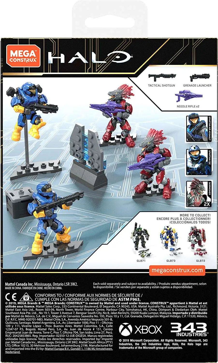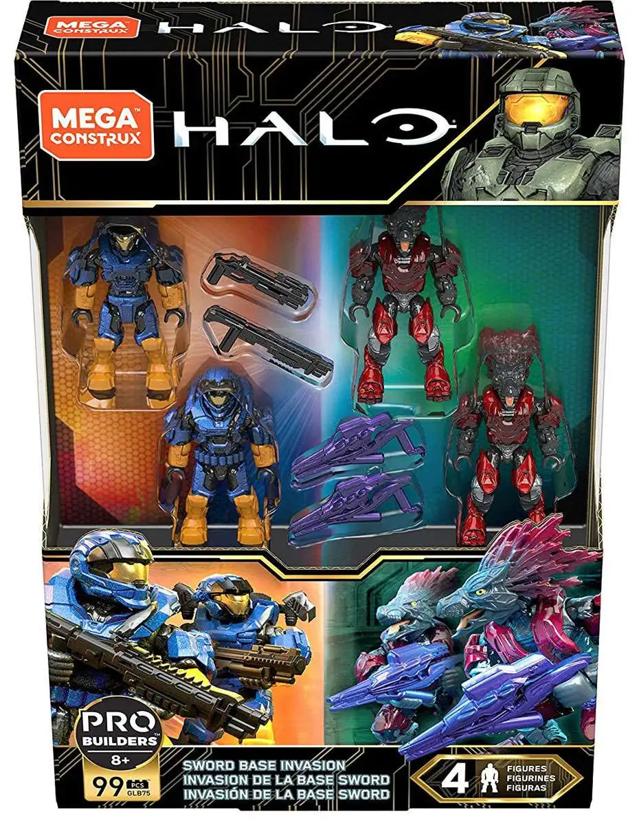 Defend Sword Base against a Covenant Invasion! Ward off the incursion, Spartans! Prepare the Sword Bases defenses against a Skirmisher invasion. Equip 2 buildable Spartan micro action figures with authentic Air Assault and CQC armor and arm them with a Grenade Launcher and Tactical Shotgun. Then, face off against an incoming force of 2 Skirmishers with detachable armor and Needle Rifles and make it a stand to remember! Ideal for Probuilders, ages 8 and up.