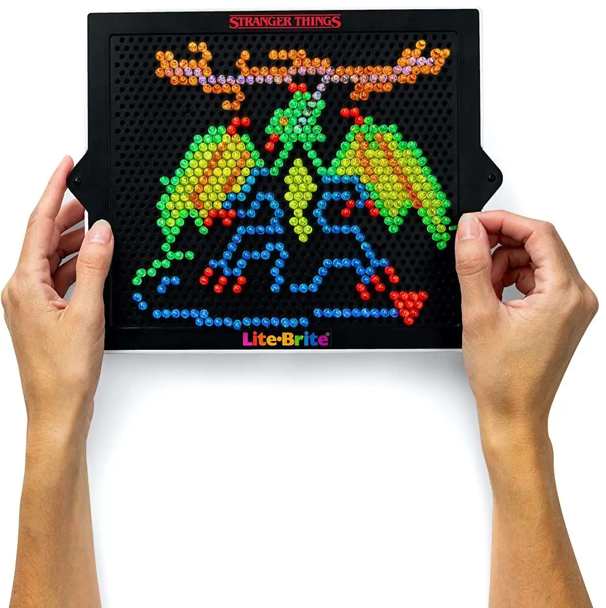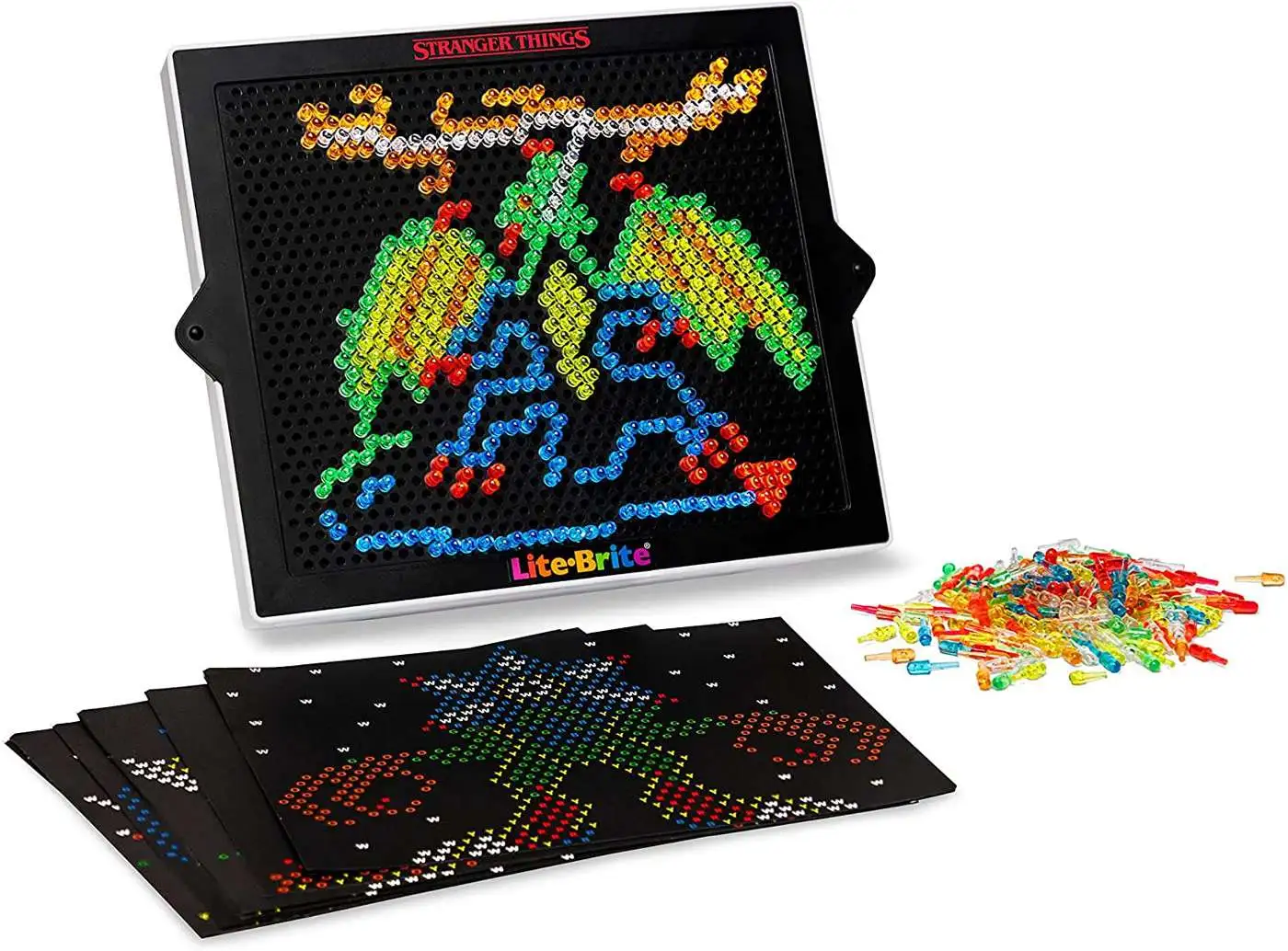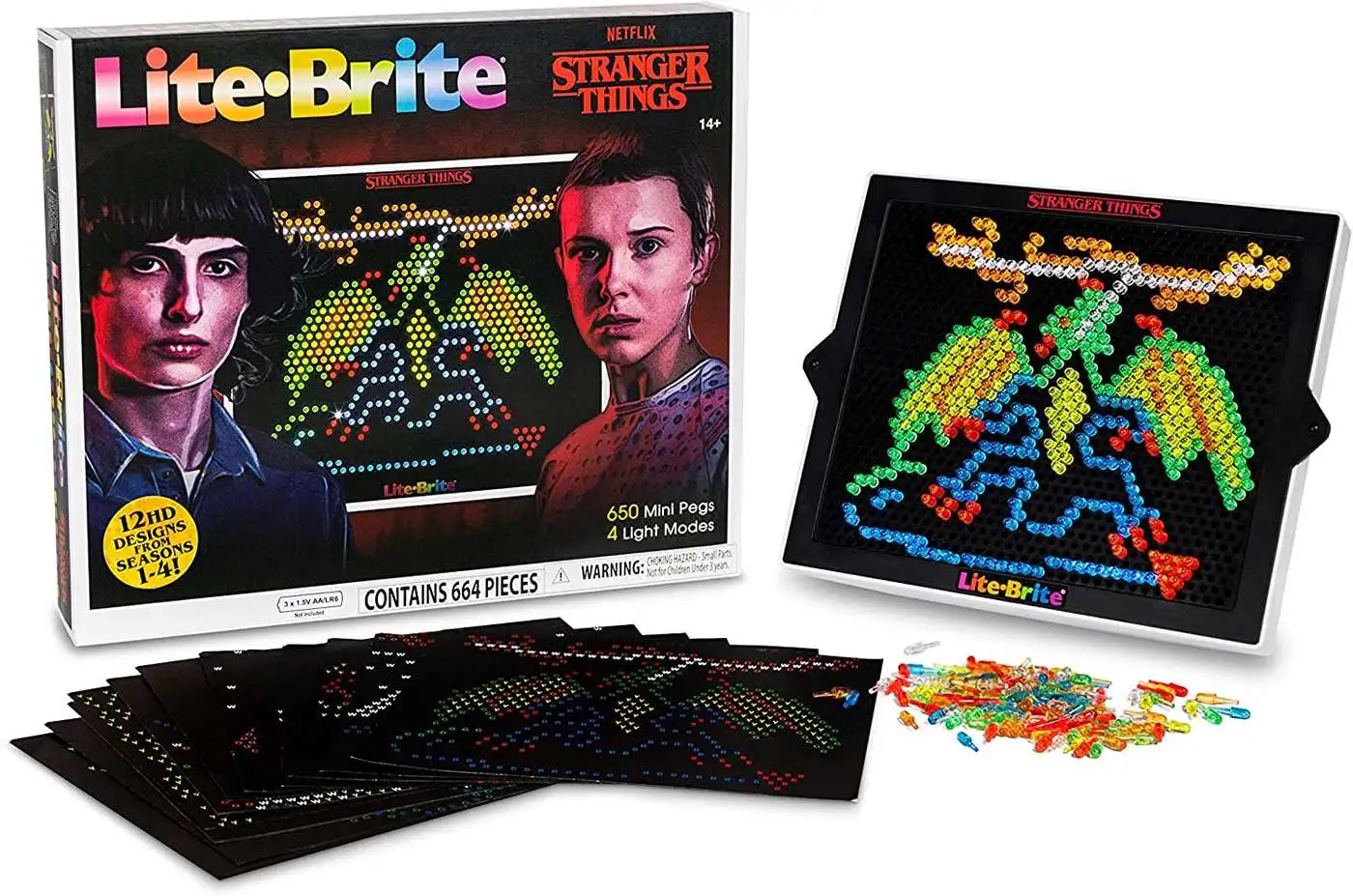 Your favorite retro toy teams up with Stranger Things for their next big release of Season 4 in 2022! Now you can create art with light with this high-definition Stranger Things Special Edition, Best of 4 Seasons Lite-Brite set in retro packaging for fans 14 years and up to collect and display. This set includes 12 HD Design Templates featuring your favorite monsters and icons from both season 4 and the entire series! This set features templates with the iconic holiday lights, the Demogorgon, and more! Use one of the 12 HD design templates or use your imagination to create art with light in high-definition! This set also contains 650 mini pegs in multiple colors to add detail to your creations (3x the pegs than the Lite-Brite Ultimate Classic). This special edition Lite-Brite features more holes and more definition! The enhanced grid includes 50% more holes than the Classic grid to create more definition in designs. It also features 4 color-changing light patterns (white light, alternating flash, all-flash, rotating flash) to light up your art! Every Stranger Things fan will want to celebrate the release of Season 4 with this Special Edition set. This Lite-Brite set makes a great gift and is perfect for every Stranger Things fan!