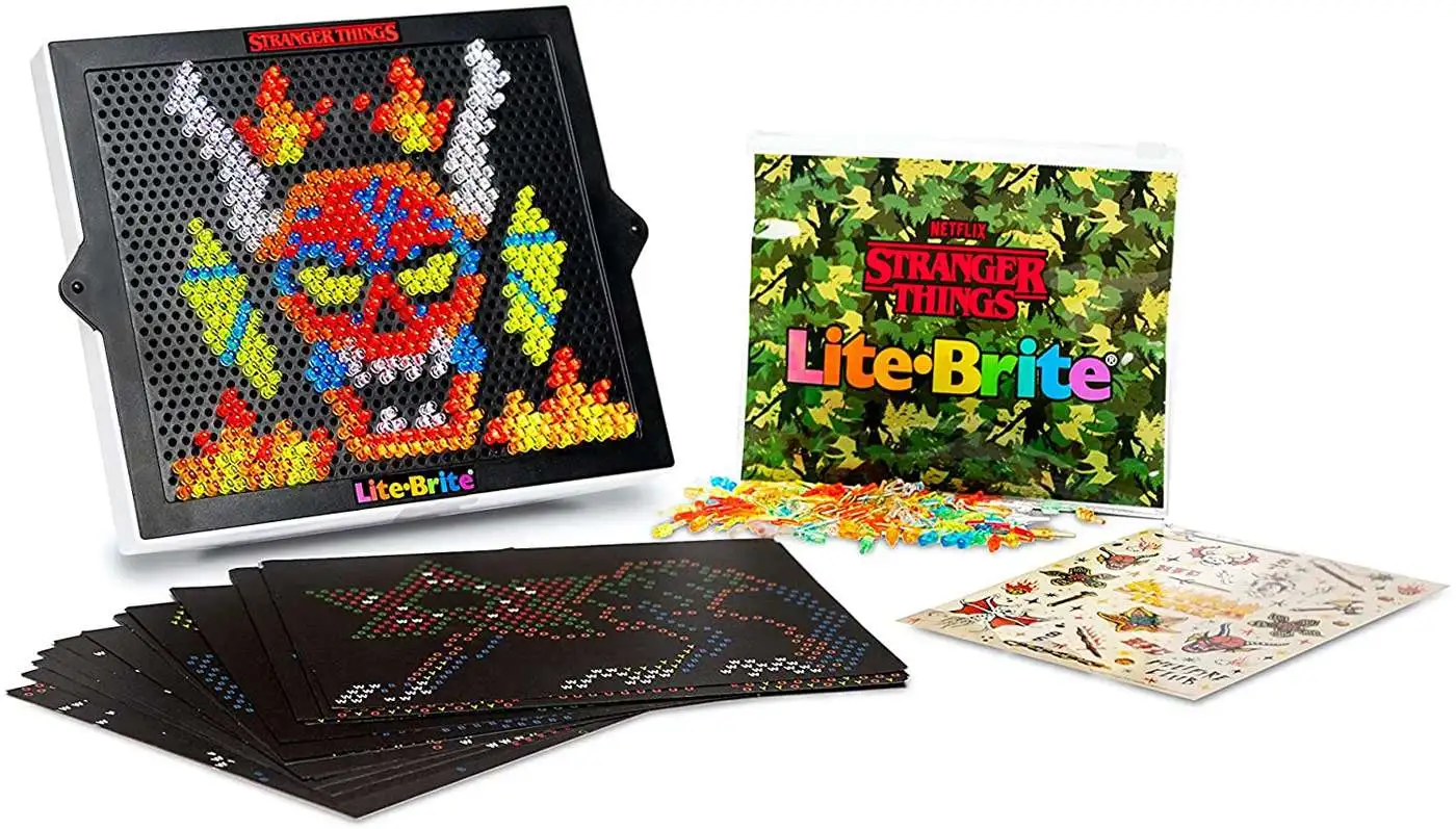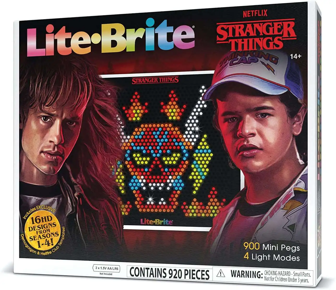 Your favorite retro toy teams up with Stranger Things for their next big release of Season 4 in 2022! Now you can create art with light with this high-definition Stranger Things Special Edition Demogorgan Hunters Lite-Brite set in retro packaging for fans 14 years and up to collect and display. This set includes 16 HD Design Templates exclusive Demogorgan Hunter and Hellfire Club designs, plus templates with your favorite monsters and icons from the entire series. Use one of the 16 HD design templates or use your imagination to create art with light in high-definition! This set also contains 900 mini pegs in multiple colors to add detail to your creations (4x the pegs than the Lite-Brite Ultimate Classic). It also features a branded pouch to carry and store your pegs in, plus Stranger Things stickers to customize your unit frame. This special edition Lite-Brite features more holes and more definition! The enhanced grid includes 50% more holes than the Classic grid to create more definition in designs. Also features 4 color-changing light patterns (white light, alternating flash, all-flash, rotating flash) to light up your art! Every Stranger Things fan will want to celebrate the release of Season 4 with this Special Edition set. This Lite-Brite set makes a great gift and is perfect for every Stranger Things fan!