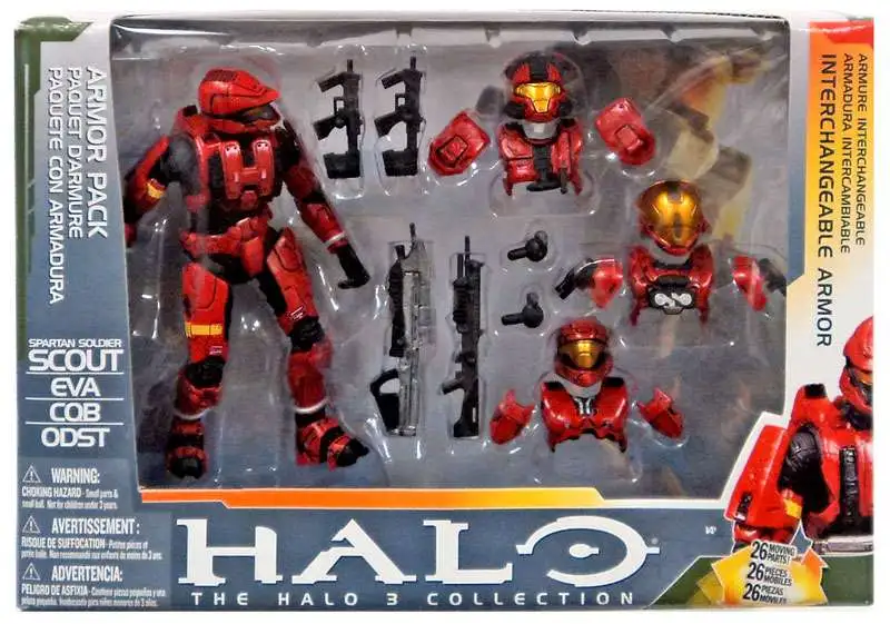 This deluxe armor pack includes a red Spartan Scout base body with interchangeable CQB, ODST and EVA head, shoulder and chest armor sets. Pack also includes an Assault Rifle, dual SMGs, Shotgun and Frag Grenade.