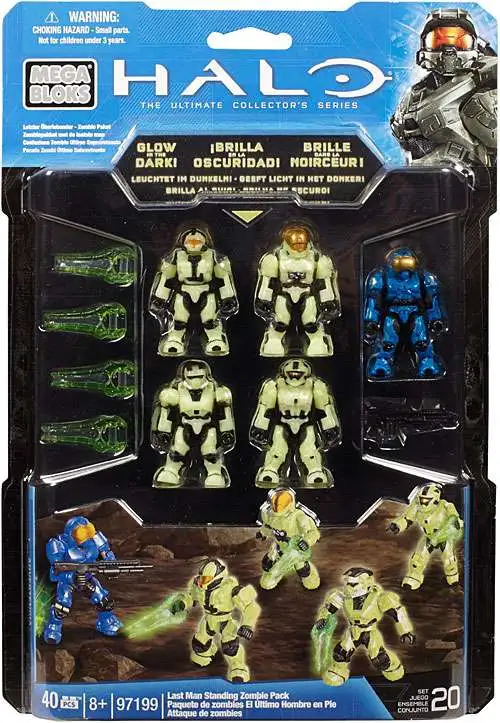 Be the final soldier to survive an Infection match with the Last Man Standing Zombie Pack by Mega Bloks Halo! A Spartan Security in new cobalt blue armor is the last man standing against four infected Spartans in zombie mode!