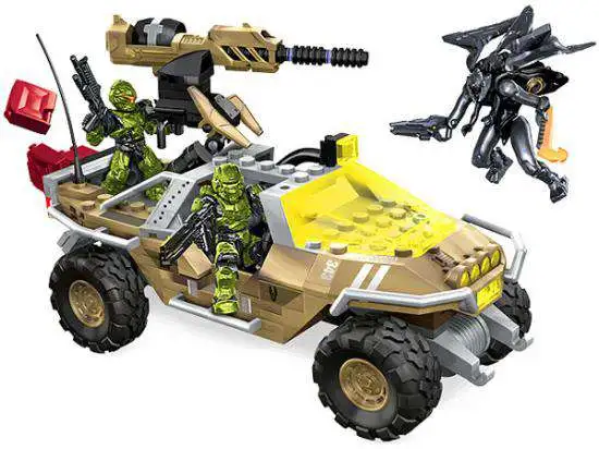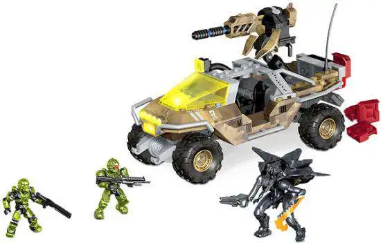 Establish your army, build and expand your units with the UNSC Night Ops Gausshog by Mega Bloks Halo! The UNSC Gausshog is the light anti-armor variant of the Warthog LRV. Equipped with a 360 rotating Gauss Cannon, real working suspension and specially engineered floodlights, the Spartan Pathfinder and his Spartan Warrior gunner open fire on a Knight Lancer armed with a Suppressor. Now in desert camo with light features and in-game sounds, the Mega Bloks UNSC Night Ops Gausshog lets you play more than ever before!