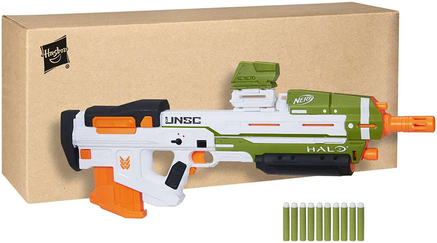 The Nerf Halo MA40 blaster is inspired by the one in Halo Infinite, capturing the look of the blaster from the next chapter in this legendary video game franchise! Imagine yourself as the Master Chief and go into battle against the alien alliance! Challenge opponents with this motorized, clip-fed blaster that unleashes 10 darts in a row. It comes with a removable, 10-dart clip and 10 Official Nerf darts, enough to fully load the clip. The Nerf Halo MA40 blaster includes a game card with a code to unlock a digital asset in the Halo game.* To start playing, hold down the acceleration button to power up the blaster’s motor, then press the trigger to fire 1 dart. Press the trigger again to fire another dart. It comes with a rail riser that attaches to the blaster’s tactical rail, so you can customize the blaster with Nerf accessories (not included). Eyewear recommended (not included).