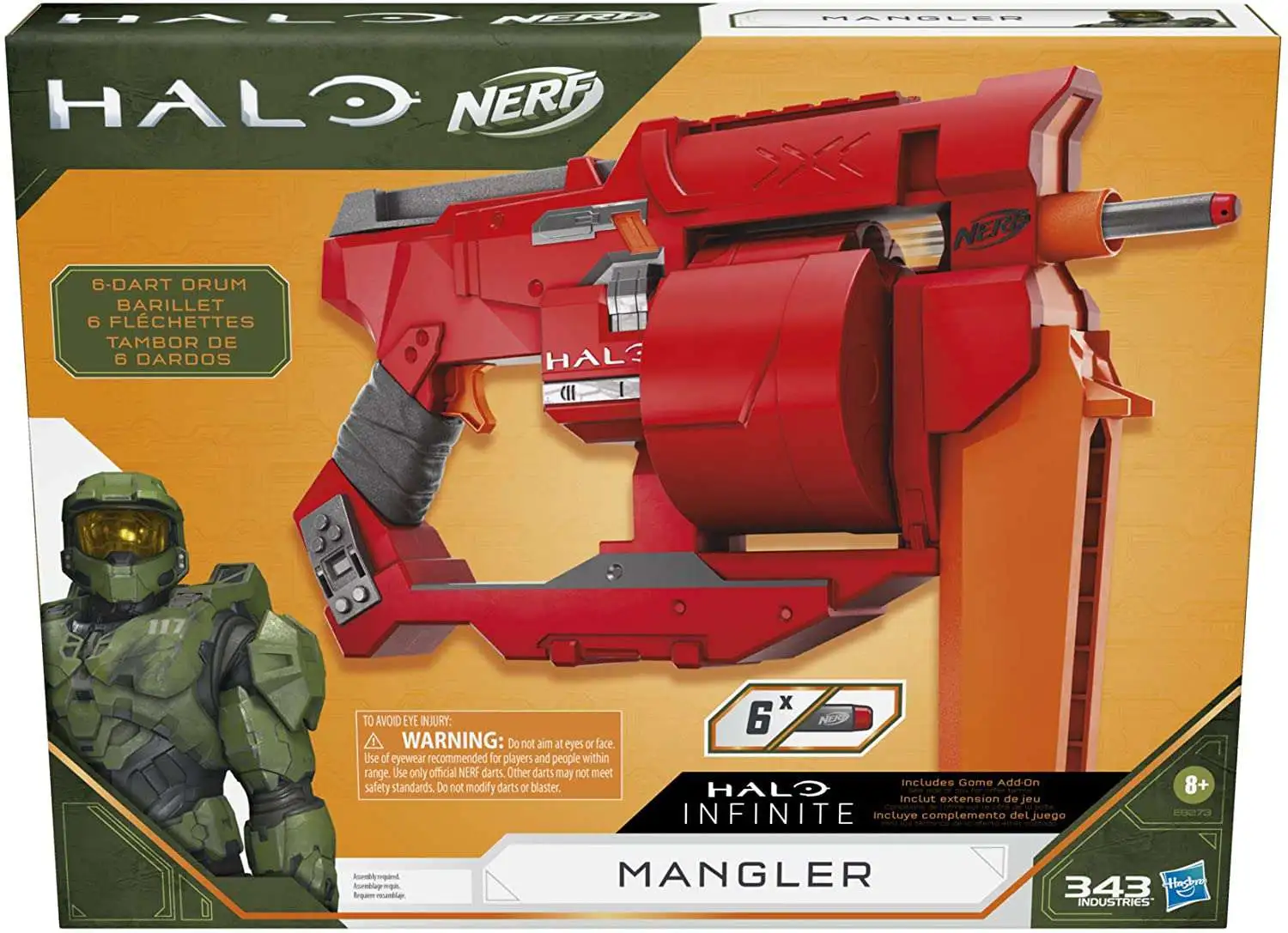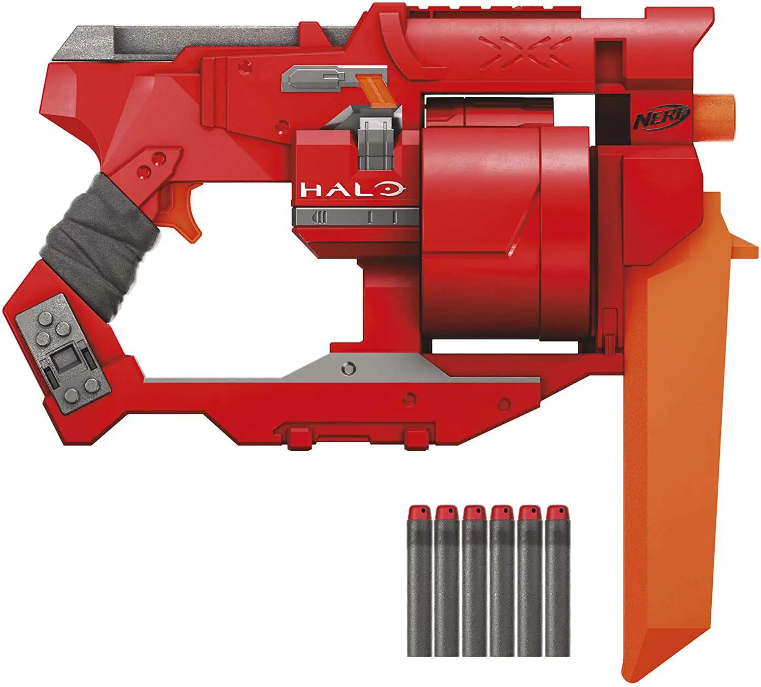 The Nerf Halo Mangler blaster is inspired by the one in Halo Infinite, capturing the look of the blaster from the next chapter in this legendary video game franchise! Imagine yourself as one of the Covenant and get ready to battle the UNSC! The blaster has a 6-dart drum and comes with 6 Official Nerf Elite darts, enough to fully load the drum. Pull back the priming handle to get the blaster ready to fire, then press the trigger to fire 1 dart. Prime and press the trigger again to fire another dart. The drum has a cover that opens so you can more easily access the drum to load darts. It includes a game card with a code to unlock a digital asset in the Halo game.