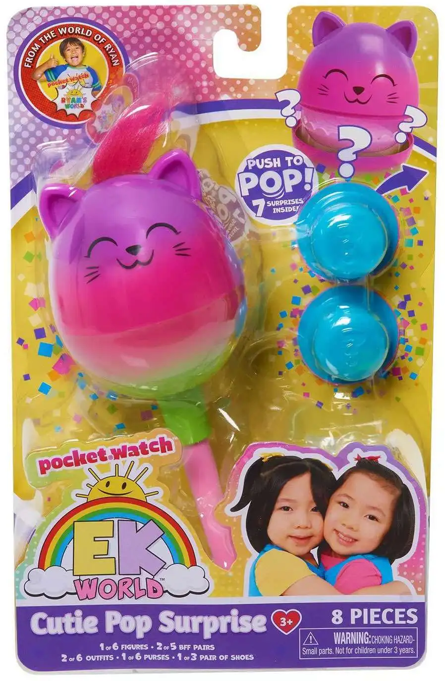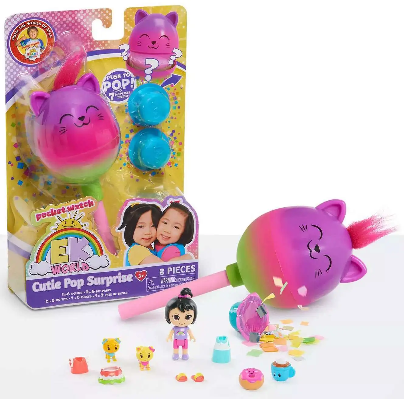 Push, pop, and play! The Emma and Kates World Cutie Pop Surprise is a super-colorful, kitty-shaped cake pop filled with 7 fun surprises! Push the stick to pop off the top and reveal 1 of 6 possible 3-inch Emma or Kate figures and a charming duo of 3 possible BFF pairs. Pop open the accessories to create a look fit for an awesome Emma and Kate playdate. Multiply the fun with additional Cutie Pop Surprises (each sold separately). Collect all 6 figures, 6 outfits, 3 foodie BFF pairs, 3 purses, and 3 pairs of shoes to mix-and-match the outfits, share, and trade with friends. The excitement of a good surprise never ends with the dynamic twins from the globally-popular Ryans World YouTube series. Bring home the Emma and Kates World Cutie Pop Surprise to create your own dynamic adventures. Ages 3+