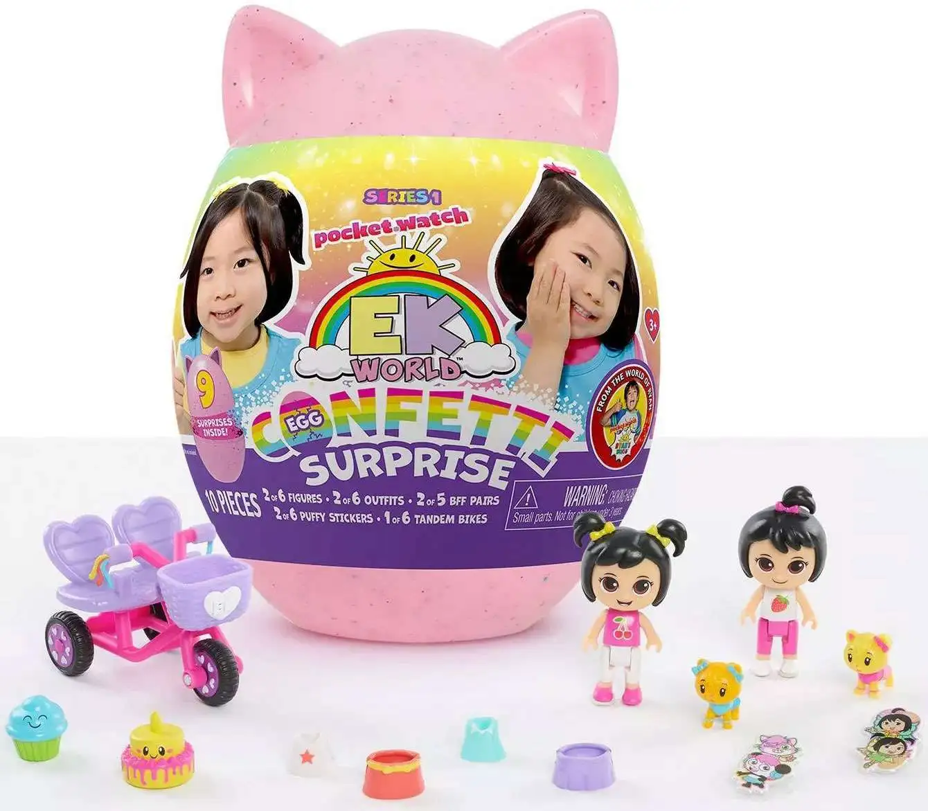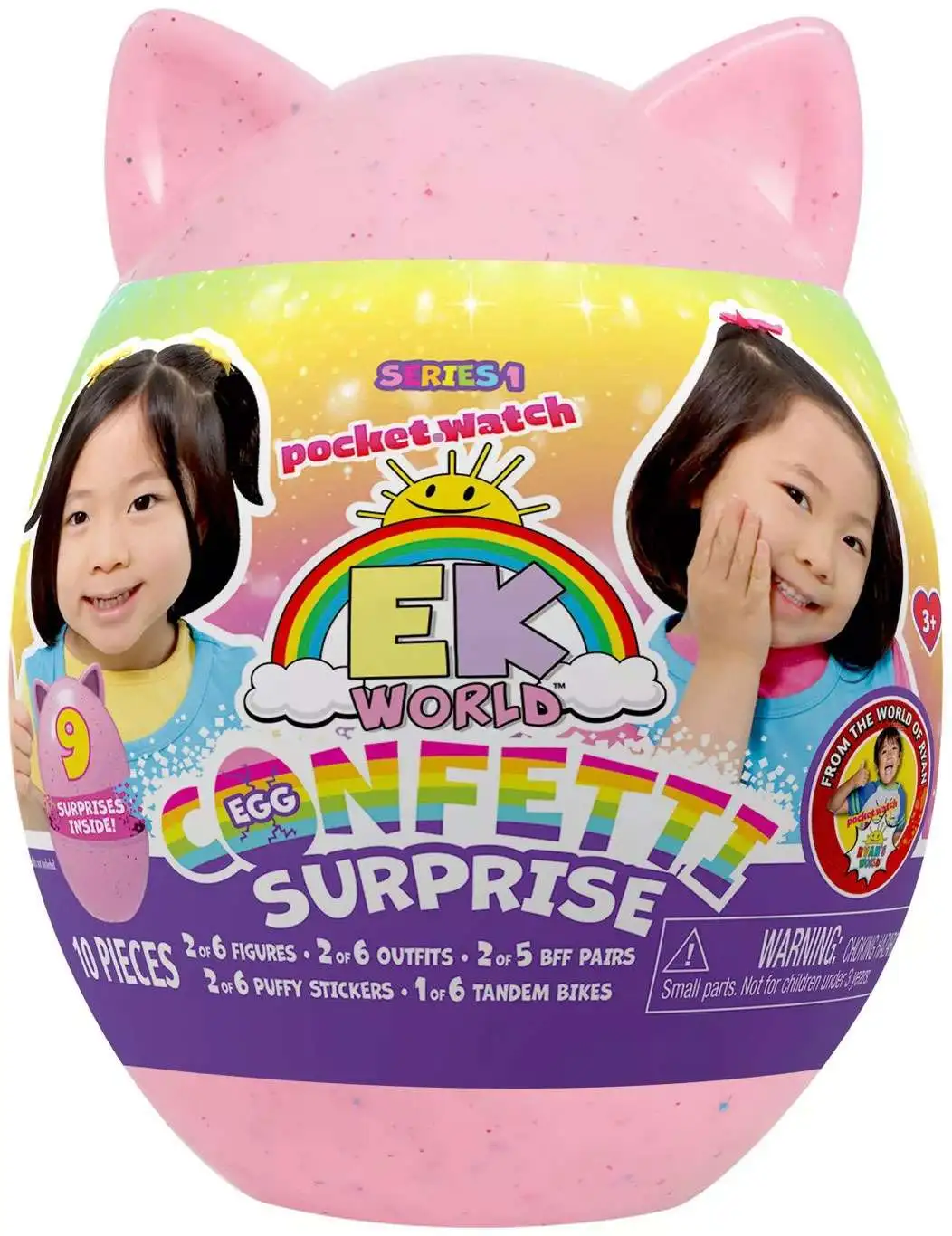 Crack open the fun of Emma and Kates World with the Confetti Egg Surprise! Each kitty-themed egg capsule is filled with 9 surprises, including 2 of 6 figures, 2 of 3 foodie BFF pairs, 2 of 6 outfits, 2 of 6 stickers, and 1 of 6 tandem bikes. Each figure stands approximately 2.8 inches tall and features articulated arms and legs that kids can pose in fun action poses. Have a blast guessing which figures and accessories are inside and create imaginative Emma and Kate-inspired adventures! Decorate journals and trinket boxes with the adorable stickers. Add additional Confetti Egg Surprises (sold separately) to collect all 6 figures, 6 outfits, 3 pairs of foodie BFFs, 6 tandem bikes, and 6 puffy stickers. Then mix and match the outfits to create different looks. The excitement of a good surprise never ends with the dynamic twins from the globally-popular Ryans World YouTube series. Bring home the Emma and Kates World Cutie Pop Surprise to create your own dynamic adventures. Ages 3+