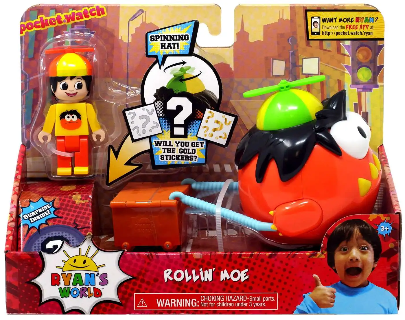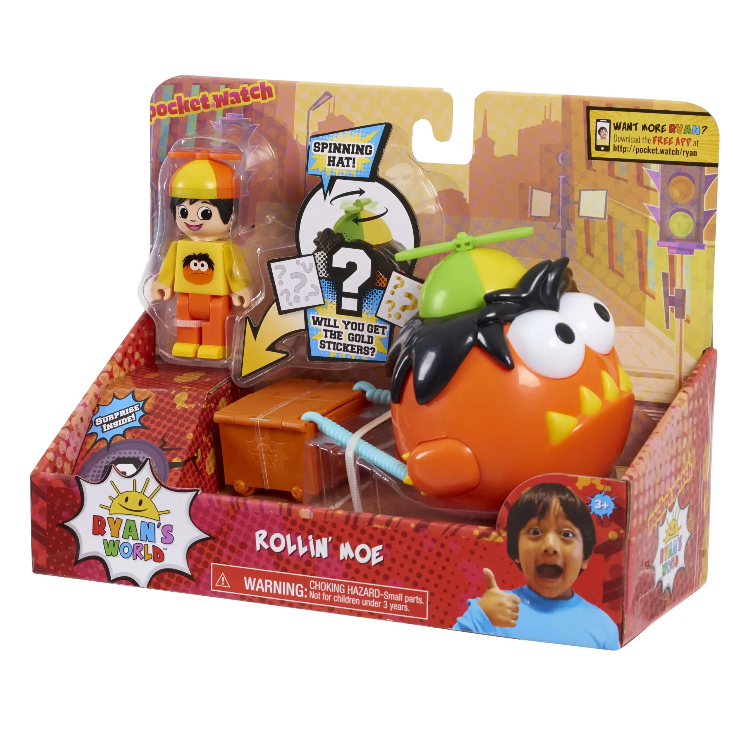 Bring home the imagination of Ryan ToysReview with the Ryans World Rollin Moe Action Fig. This super fun set includes one poseable Ryan figure, Moe, and surprise stickers! Will you get the gold stickers? Place the Ryan figure in in the box and roll Moe. Moe really pulls Ryan in the box. Moe is even wearing a hat that spins! Also look for the Ryans World Splashin Gus and Choppin Combo Panda Action Figures (sold separately). The surprise and excitement of Ryans World is never-ending with the new line of Ryans World Toys. Bring home the Ryans World Action Figs and the rest of Ryans World Toys, inspired by Ryan ToysReview, and let your little fan bring their own imagination to life! Ages 3+