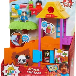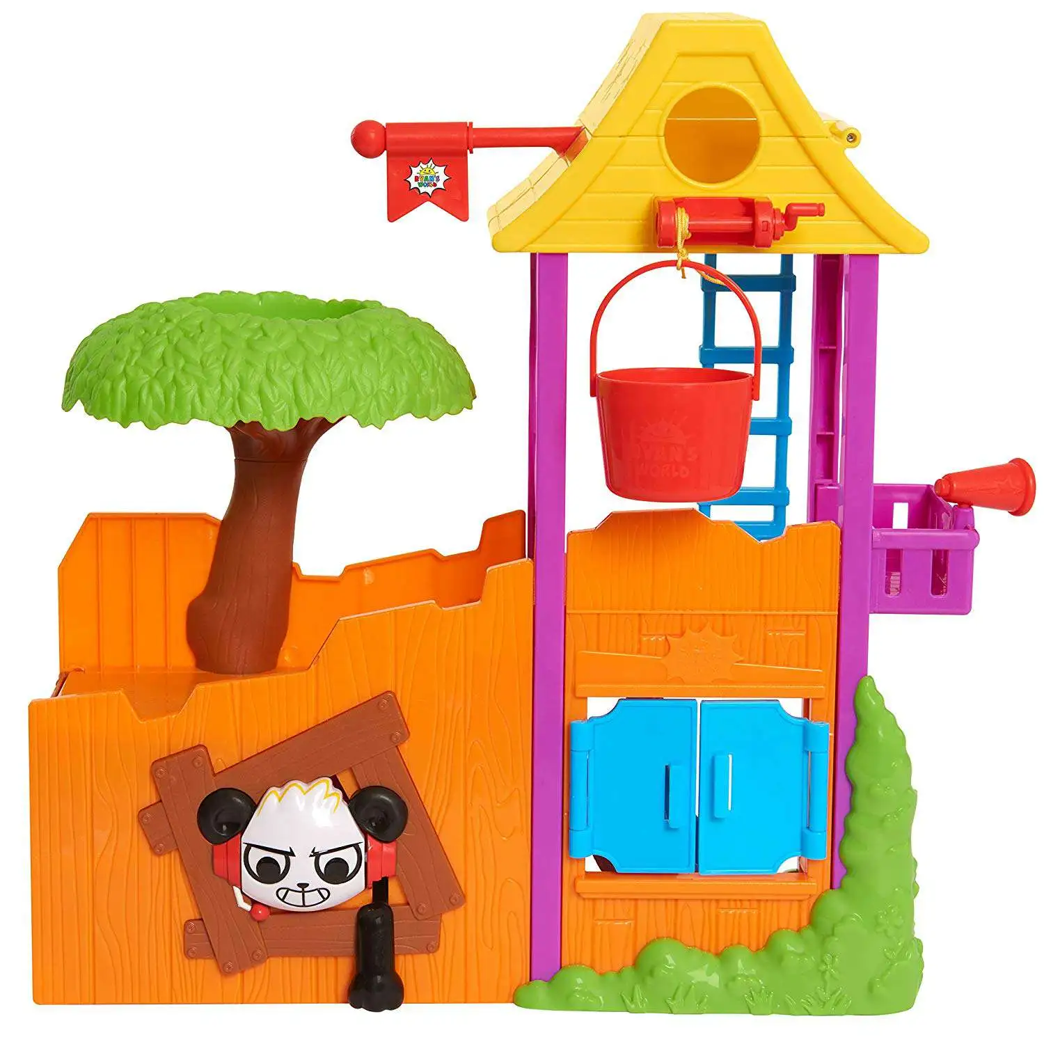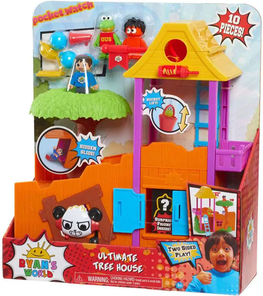 Bring home the imagination of Ryans World with the Ryans World Ultimate Tree House! This awesome playset is full of fun surprises and includes four figures: Ryan, Moe, Gus, and one exclusive Peck figure. Will you receive the rare glitter Peck, or the ultra-rare metallic Peck? Take a ride with Moe in the bucket to the top of the playset and watch for visitors from the look-out tower. Use the telescope accessory to see what is off in the distance. Slide the trap door to reveal the hidden slide and ride down from the look-out tower! Have even more fun swinging in the chill spot with Gus, but watch out for Combo Pandas Smash! Hi-Ya! The Ryans World Ultimate Tree House includes one awesome playset, one Ryan figure, one Moe figure, one Gus figure, one exclusive Peck figure, and accessories: one water balloon launcher, one water balloon, one telescope, one bucket, and one swing chair.buy = ‘Y’;