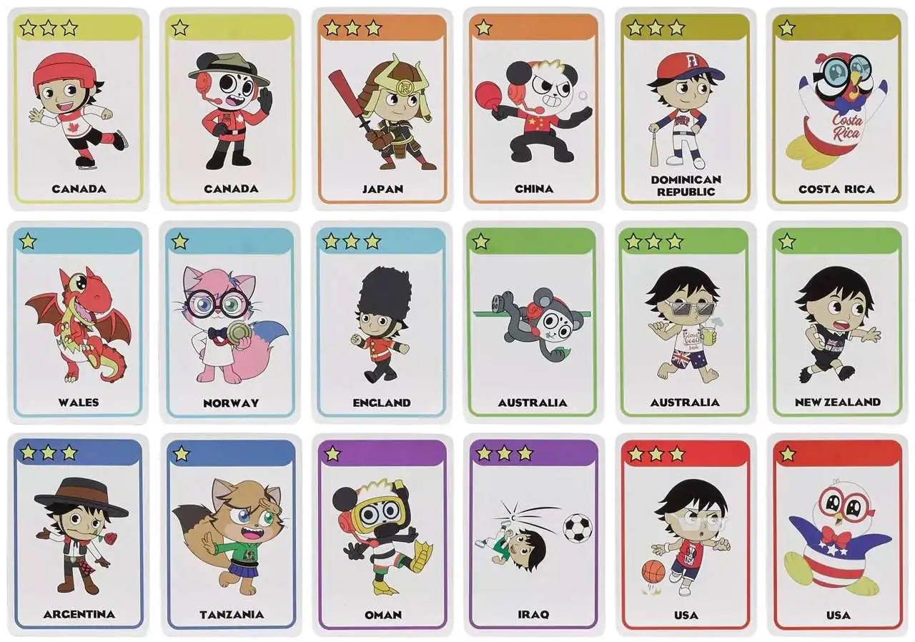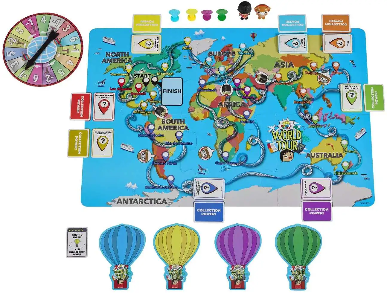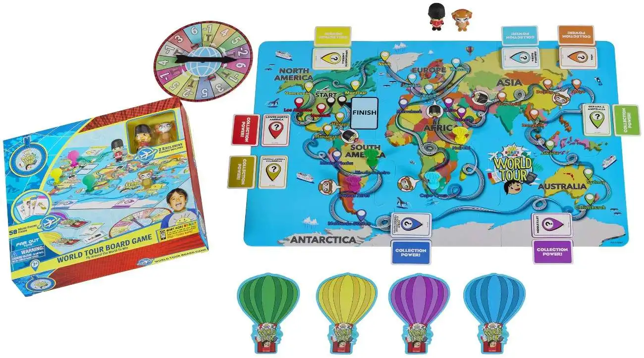 Fly around the world with Ryan and the combo crew! In this educational and adventurous board game, kids will learn about the countries and regions of the world while playing with their favorite Ryans World characters. Race your hot-air ballown around the world while picking up power-ups, collecting Micro-figure cards and earning rarity stars. At the end of the trip, the player who earns the most rarity stars wins!