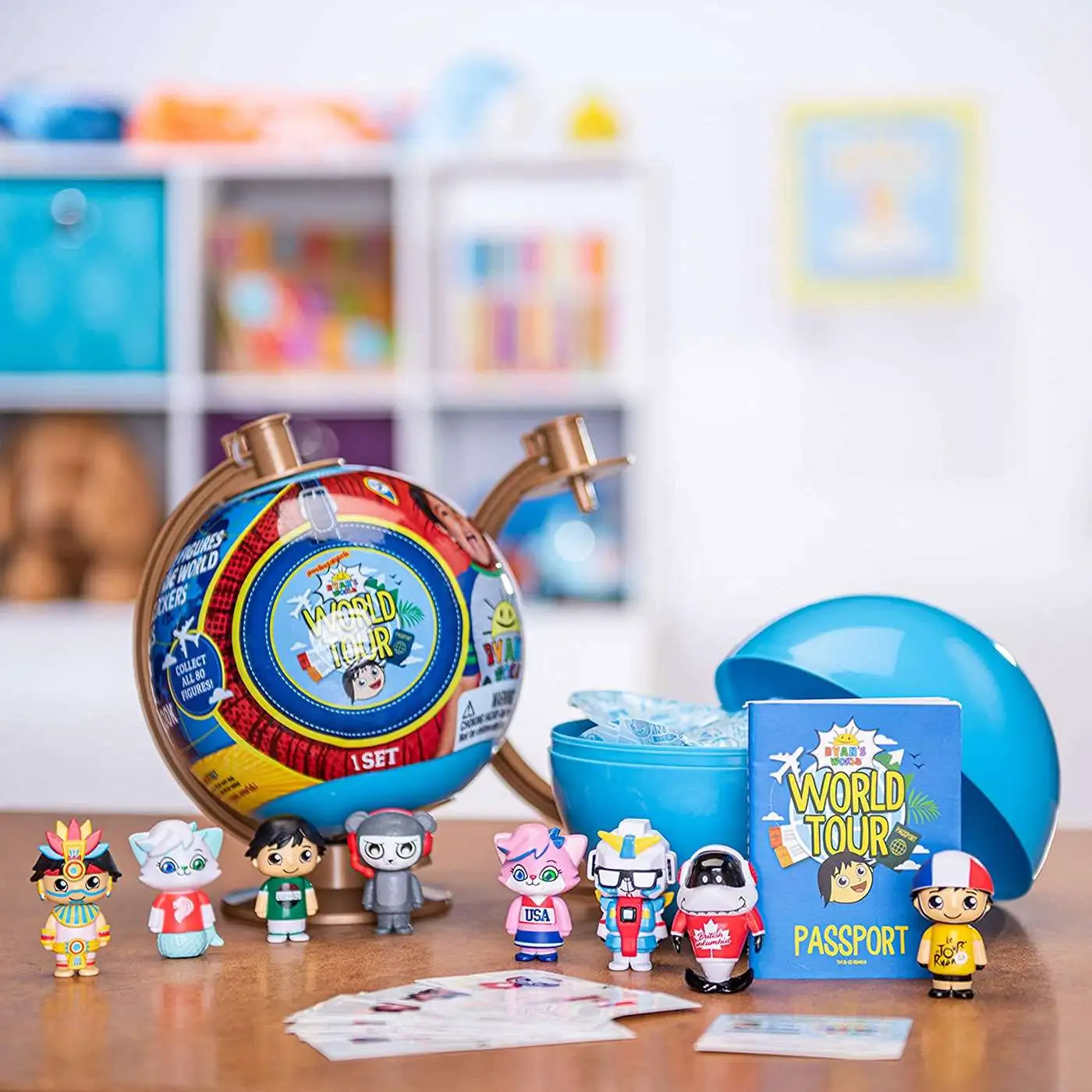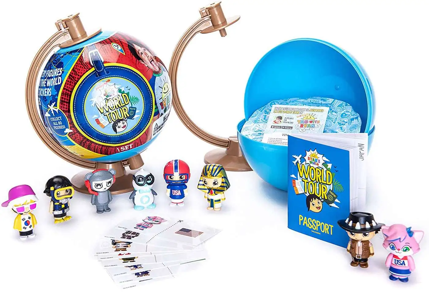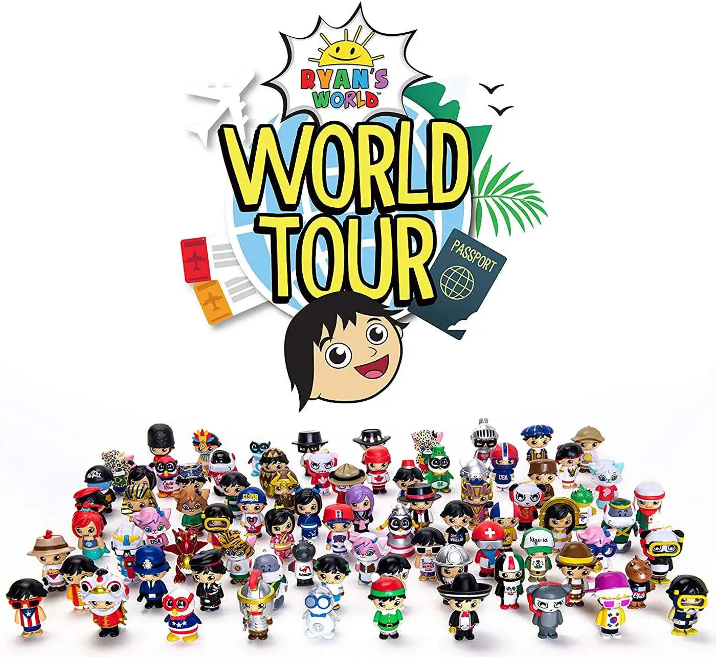 Ryan’s World Tour Globe Mystery Playset Ryan’s off on his travels, taking part in the ultimate World Tour There’s 80 brand new Ryan figures from all corners of the globe America, Canada, Japan, Switzerland, UK – collect them all Each figure comes with a special flag sticker to add into your World Tour Collector Passport Includes 8 World Tour figures, 8 stickers, Globe Playset and World Tour Collector Passport.
